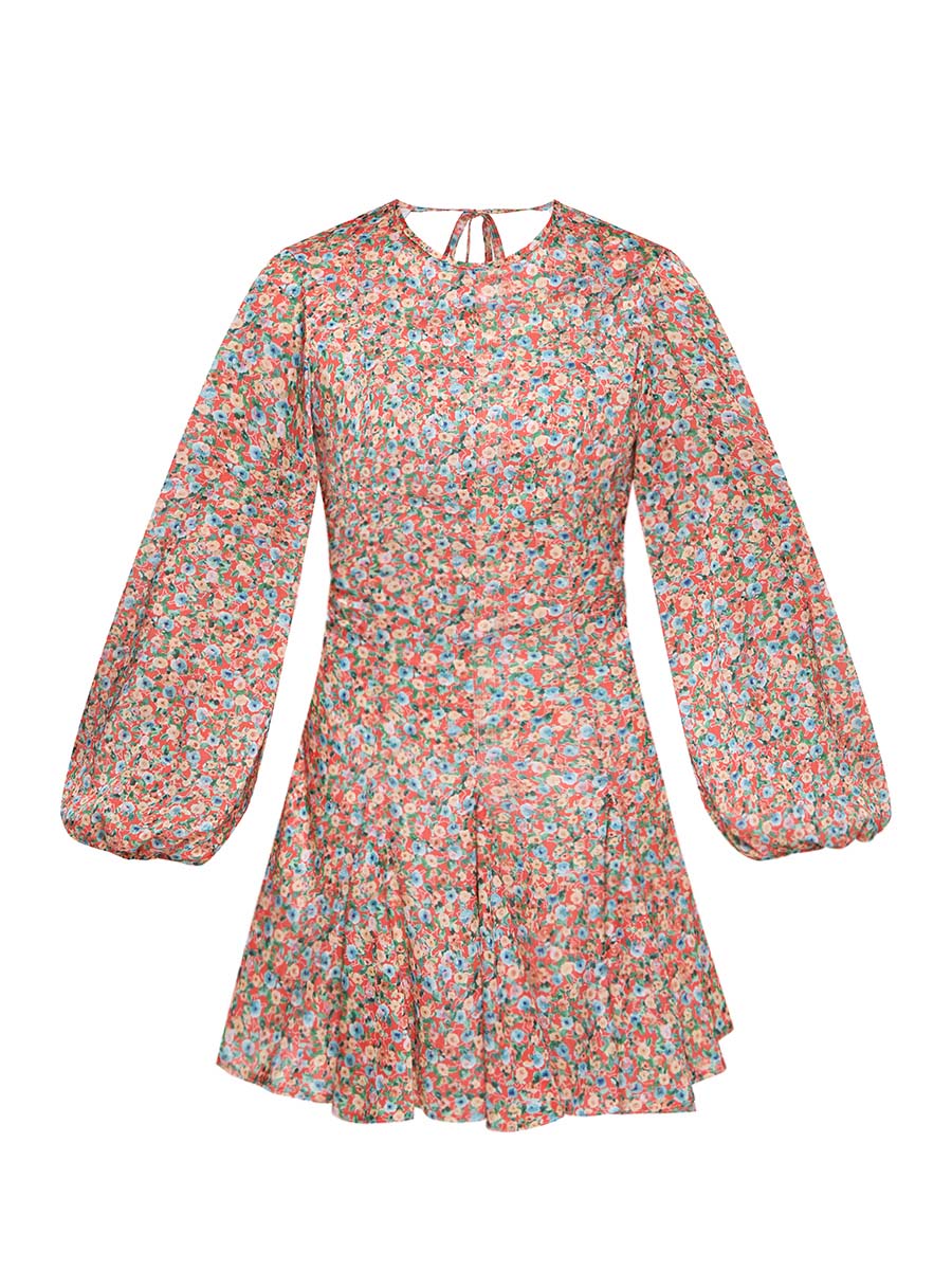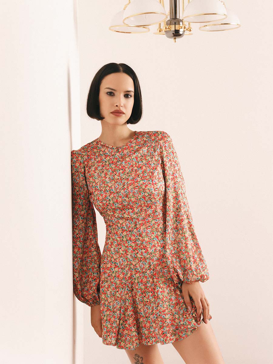 This mini dress features a fitted silhouette with a lightweight lining for added comfort. The long sleeves are finished with delicate elastic cuffs, creating a charming volume. The cinched waist beautifully accentuates femininity, while the flowy skirt adds lightness and grace to every step.