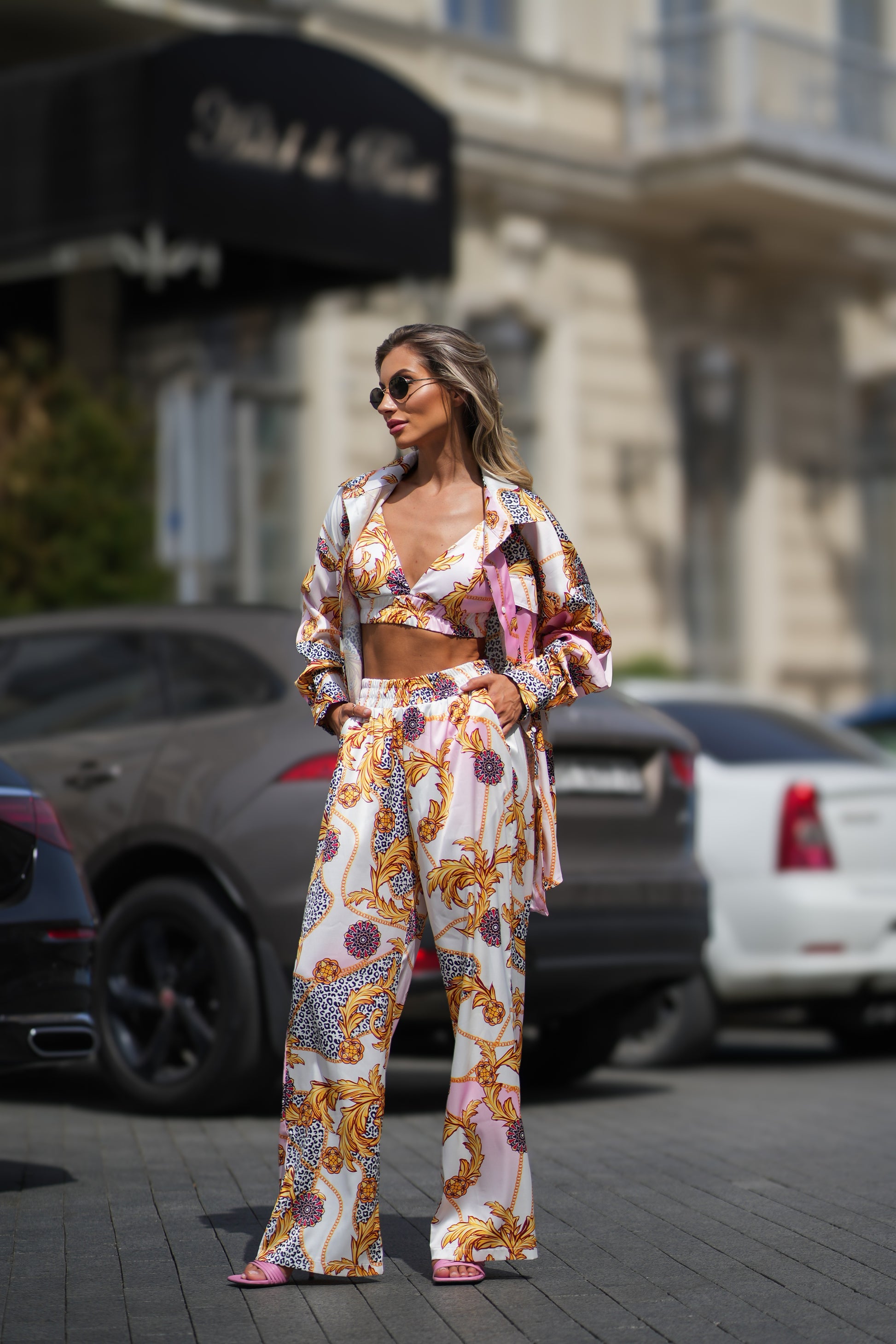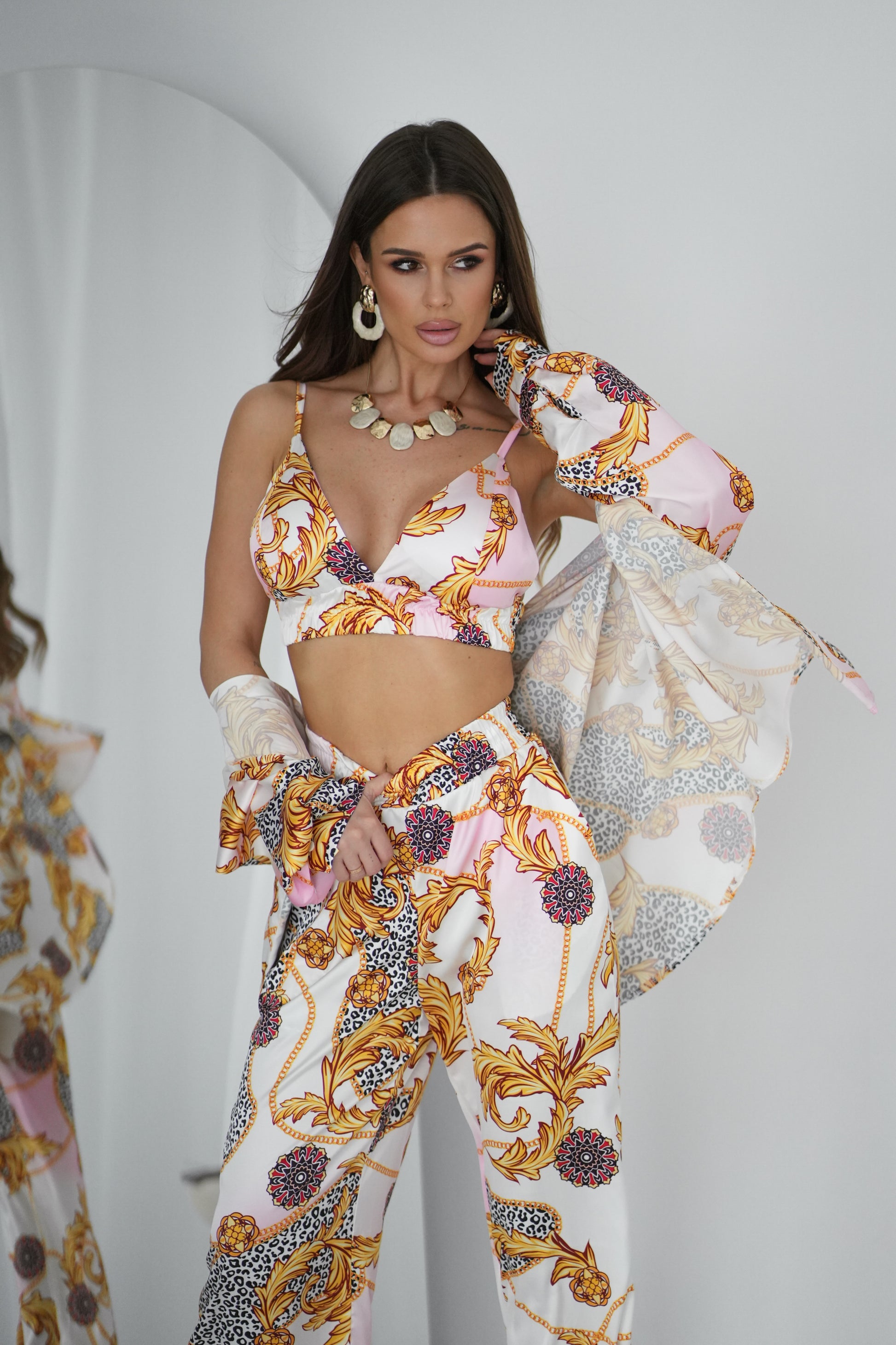 This stylish suit is the perfect blend of elegance and comfort. The set includes a cropped top with a deep V-neckline, loose-fitting elastic-waist pants, and a lightweight shirt that can be worn separately or layered. The striking print with golden accents and pink details adds a bold and sophisticated touch. Ideal for summer walks, vacations, and chic outings.