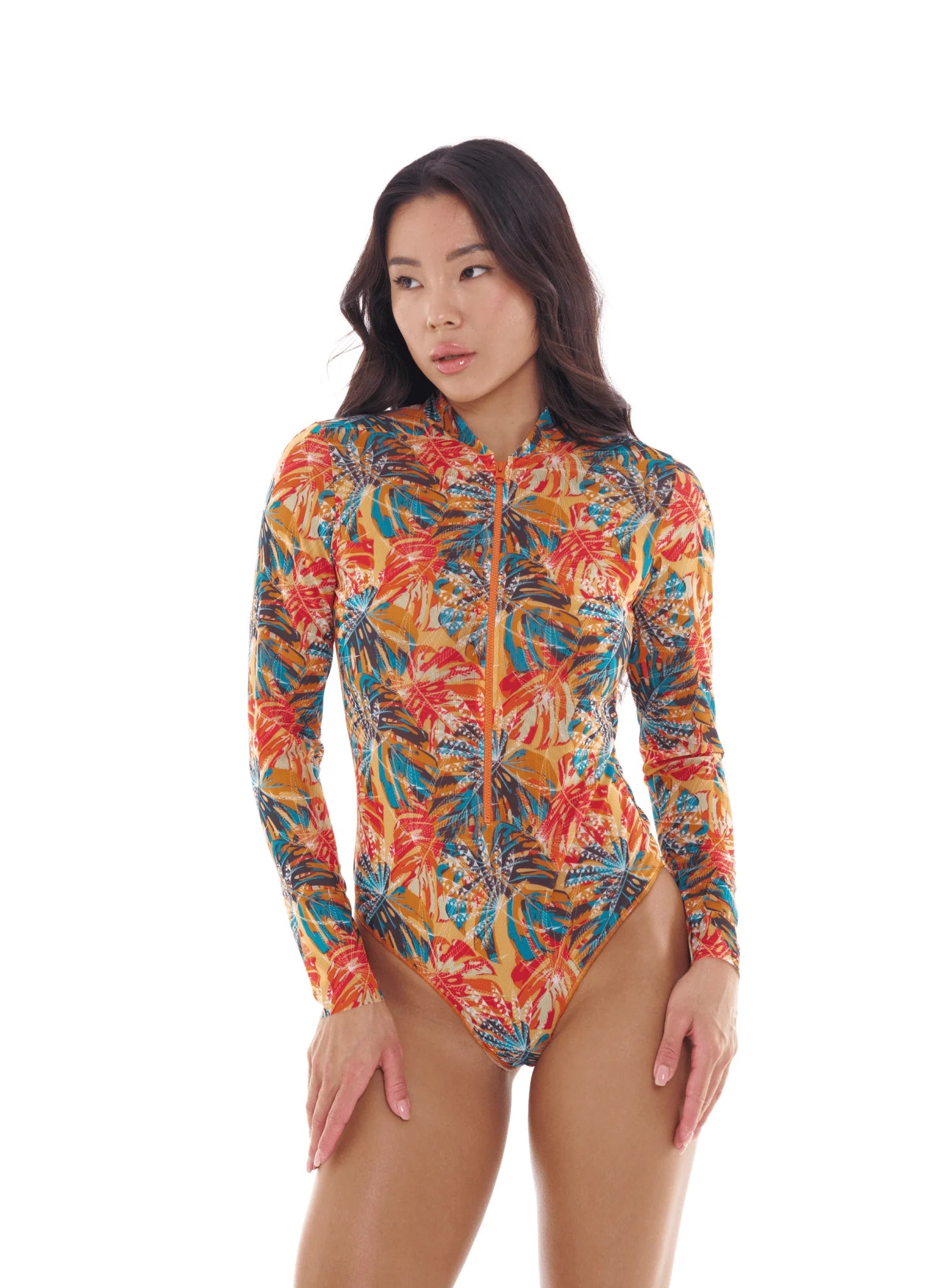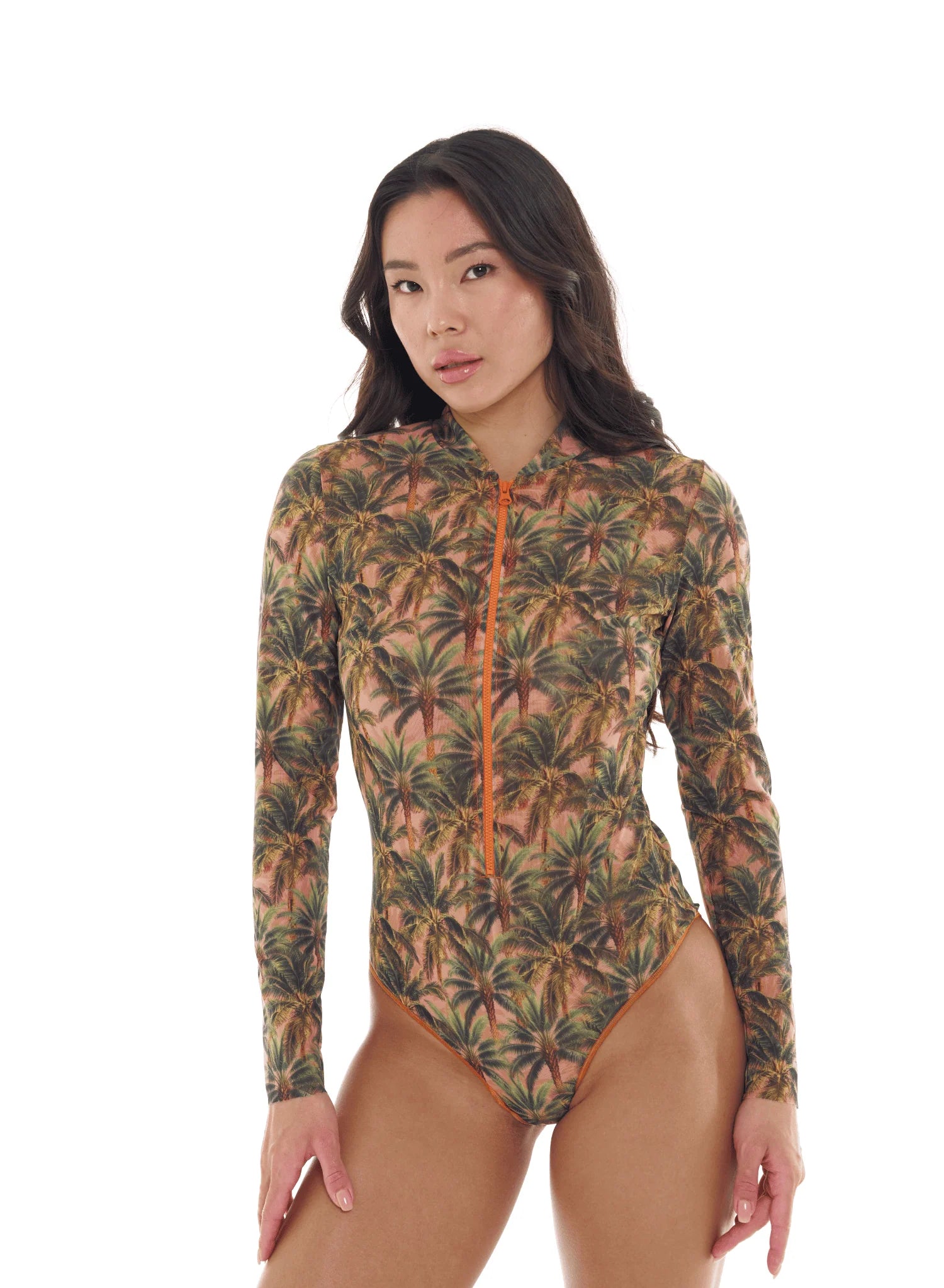 TAN THROUGH SWIMSUIT ONE-PIECE WITH ZIPPER SLEEVES